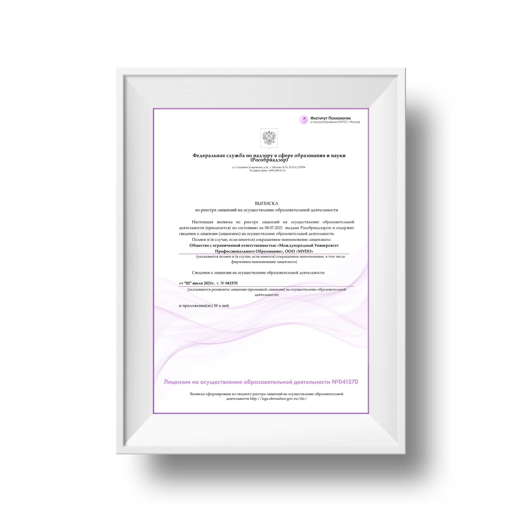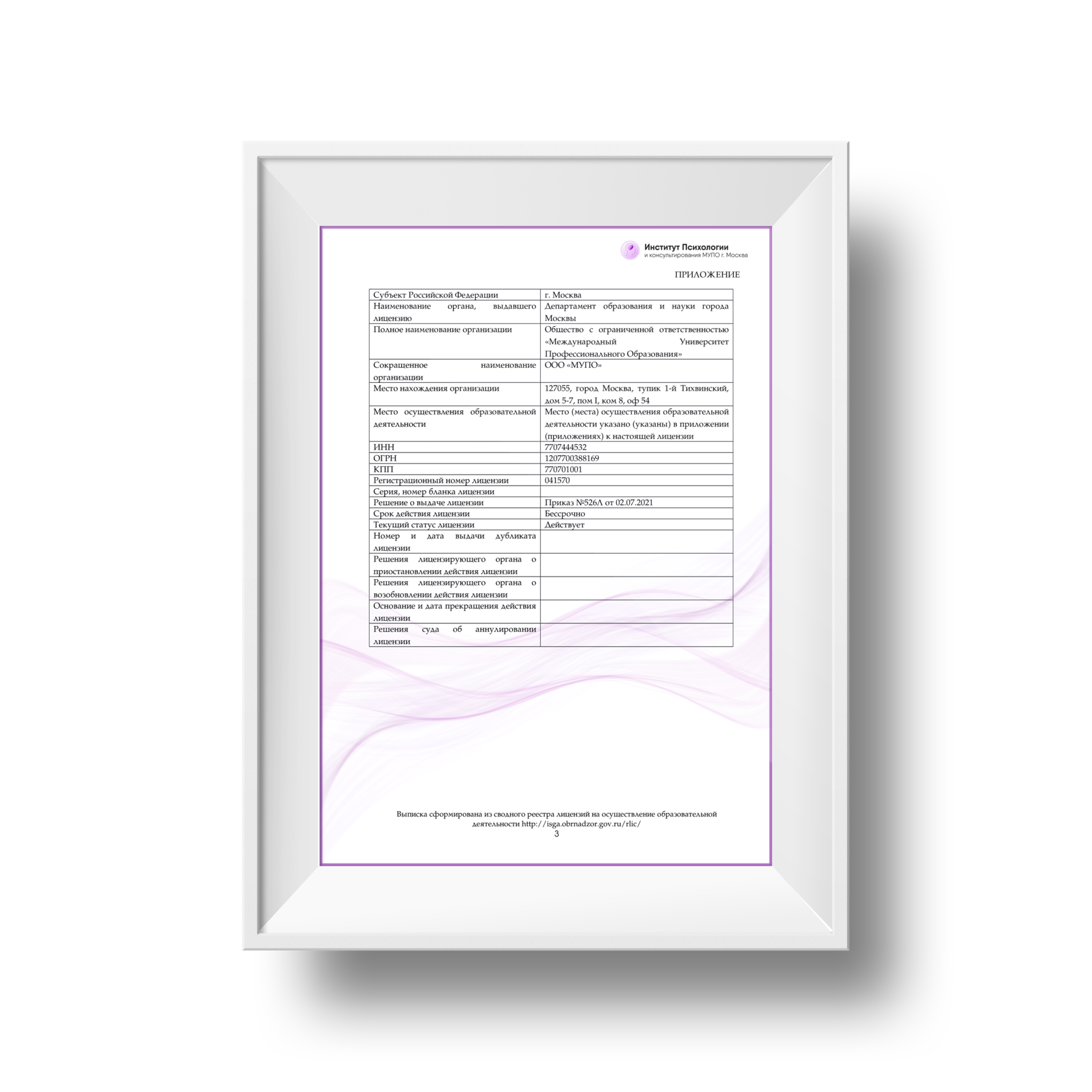 Лицензия выдана Департаментом образования г. Москвы, рег.номер 041570, решение о выдаче Приказ от 02.07.2021г. № 526Л, срок действия Бессрочная, статус Действует.